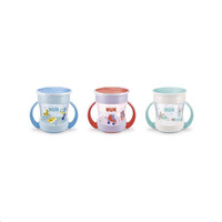 Tazza per bambini Mini Magic NUK 360° con coperchio. Chiusura rivoluzionaria che consente di bere da ogni lato senza beccuccio o cannuccia, aiutando il bambino a bere autonomamente come da una normale tazza. La tazza da allenamento con bordo per bere a 360° è resistente alle fuoriuscite e aiuta i bambini a imparare a bere da una grande tazza senza sporcarsi. Allenando i muscoli del bambino che devono svilupparsi. La bevanda inizia a fluire solo dopo che il coperchio è schiacciato dalla bocca del bambino, quindi non devi preoccuparti che il liquido fuoriesca dalla tazza. Ideale per viaggi o uscite. Destinata ai bambini a partire dai 6 mesi. Senza BPA. Caratteristiche: