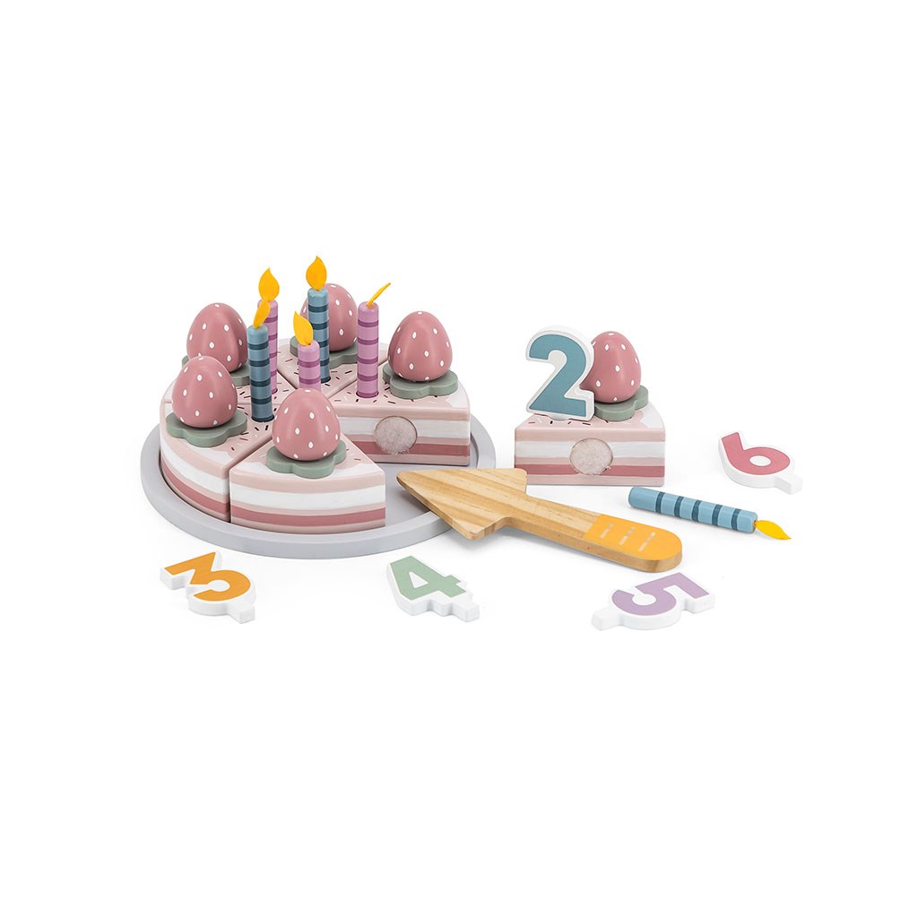 La torta di legno è un giocattolo destinato ai bambini più piccoli, che amano giocare alle feste e come complemento per i set da cucina. Stimola l'immaginazione e la creatività, oltre a favorire lo sviluppo sociale e il gioco di ruolo. Il set è composto da 26 blocchi che rappresentano pezzi di torta, decorazioni di fragole, candele, numeri, piatti e palette. Regalati una festa di compleanno.