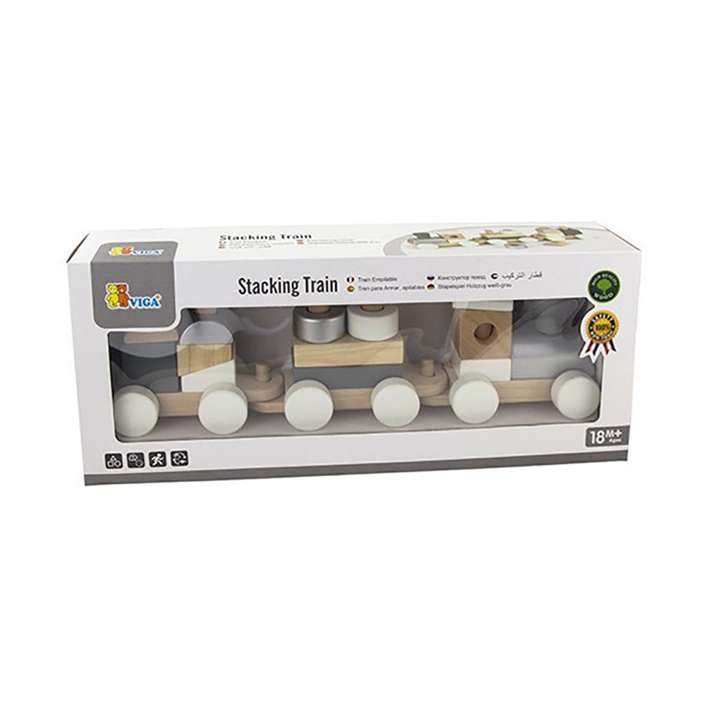 Un trenino grigio e bianco con vagoni da tiro è progettato per i bambini attivi. Il trenino sviluppa la coordinazione occhio-mano, supporta il pensiero logico e consente giochi creativi.