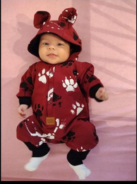 Tutina per neonato in cotone originale del marchio ceco New Baby Paw. La tutina è interamente stampata con un motivo infantile. È realizzata in un materiale di alta qualità in cotone con elastan e una fodera in cotone. Il tessuto è liscio e piacevole al tatto. La chiusura pratica con bottoni a pressione lungo tutta la lunghezza facilita notevolmente il vestire e il cambio. La tutina ha un pratico cappuccio con orecchie, orli elastici più larghi su maniche e gambe e l'intera parte interna è foderata in cotone, che aumenta il comfort di indossarla. Il bambino si sentirà molto comodo e piacevole in questa tutina. Composizione: 95% cotone, 5% elastan, fodera - 95% cotone, 5% elastan. Adatta per primavera e autunno.